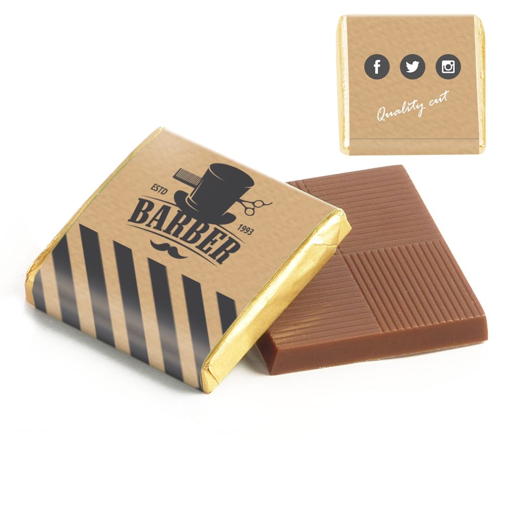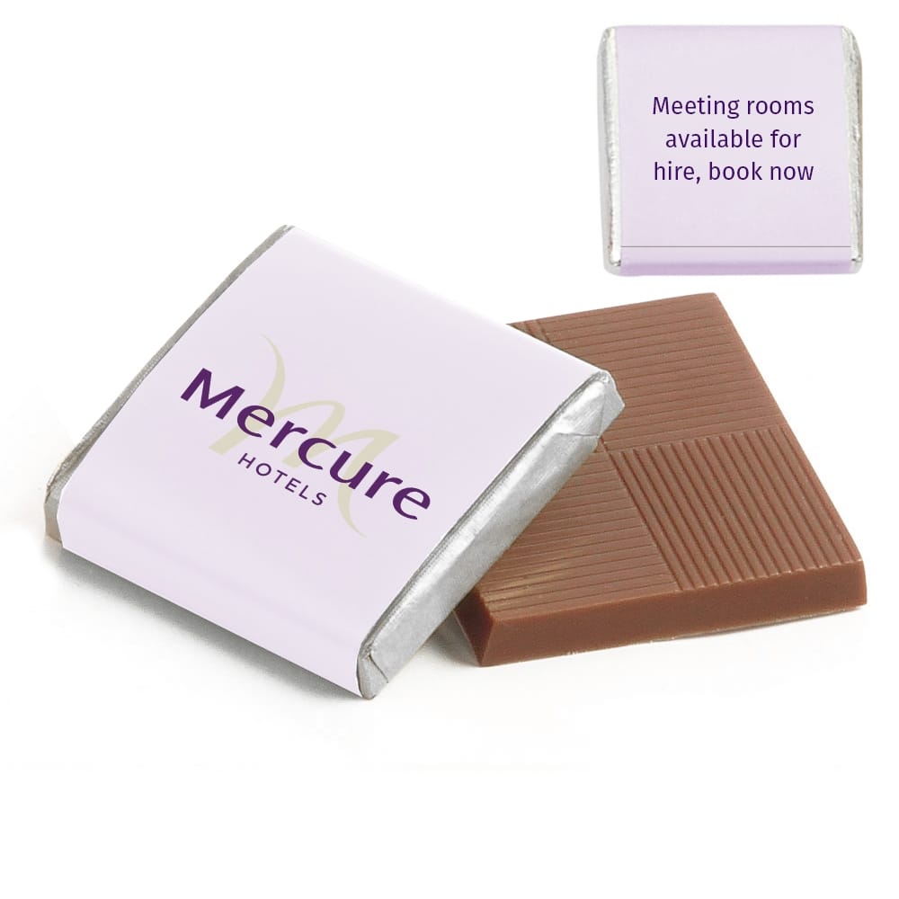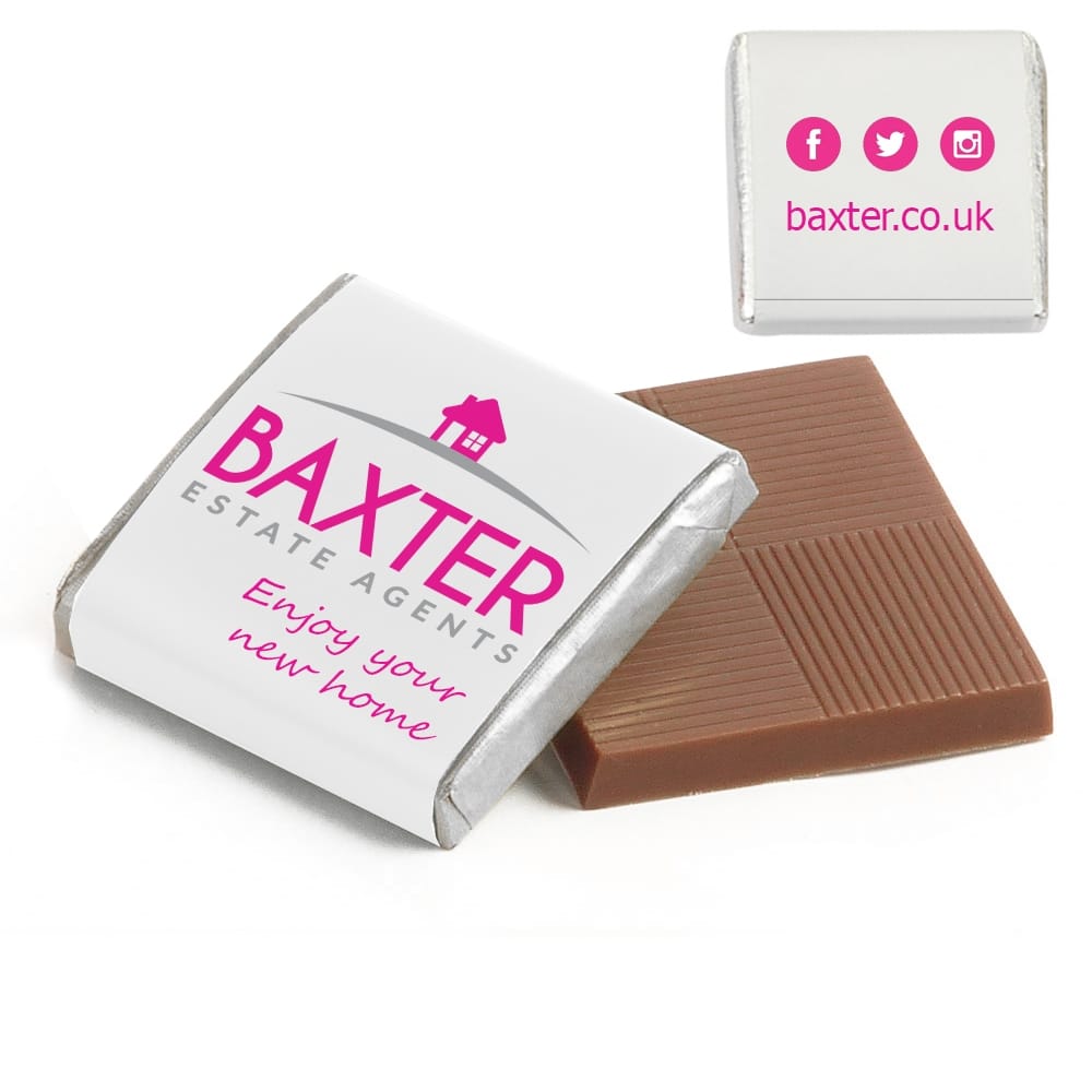 Full Colour Promotional Chocolate Neapolitans Freshly made luxury chocolate from here in UK. Your full colour logo/message is printed on each wrapper with delicious chocolate of your flavour. The standard chocolate size is 35mm by 35mm. However, if you would like a bespoke made bar to your logo, size and design just let us know and we can tailor make your own customised bars and boxes.