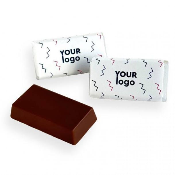 Milk chocolate with almond and hazelnut praline Full colour print 38mm by 20mm by 8mm MOQ 500 Please ask for the options and cost and we can email them to you. If you send us the logo, we can send mock ups to see and alter. Please do ask if you have any questions.
