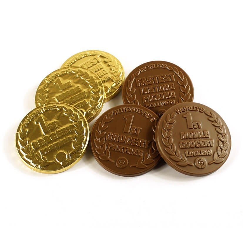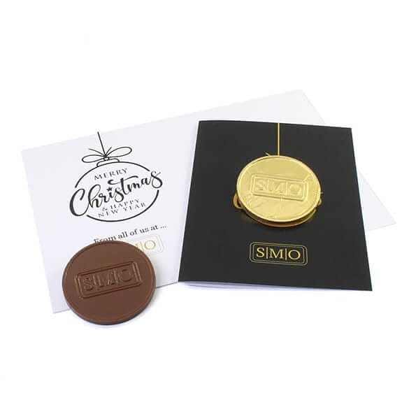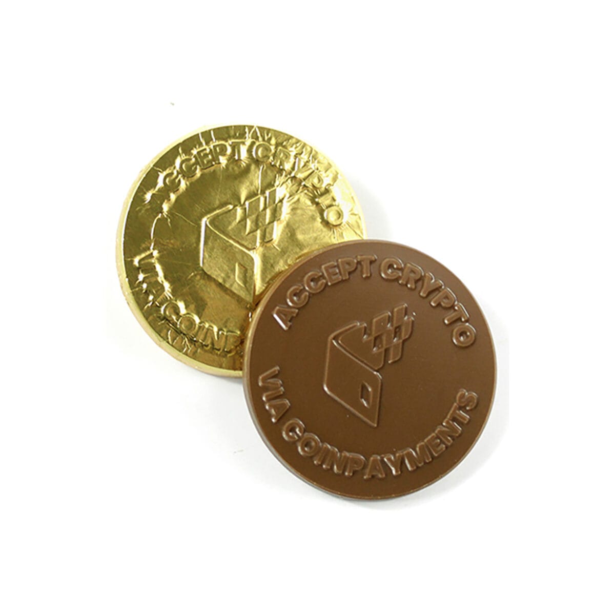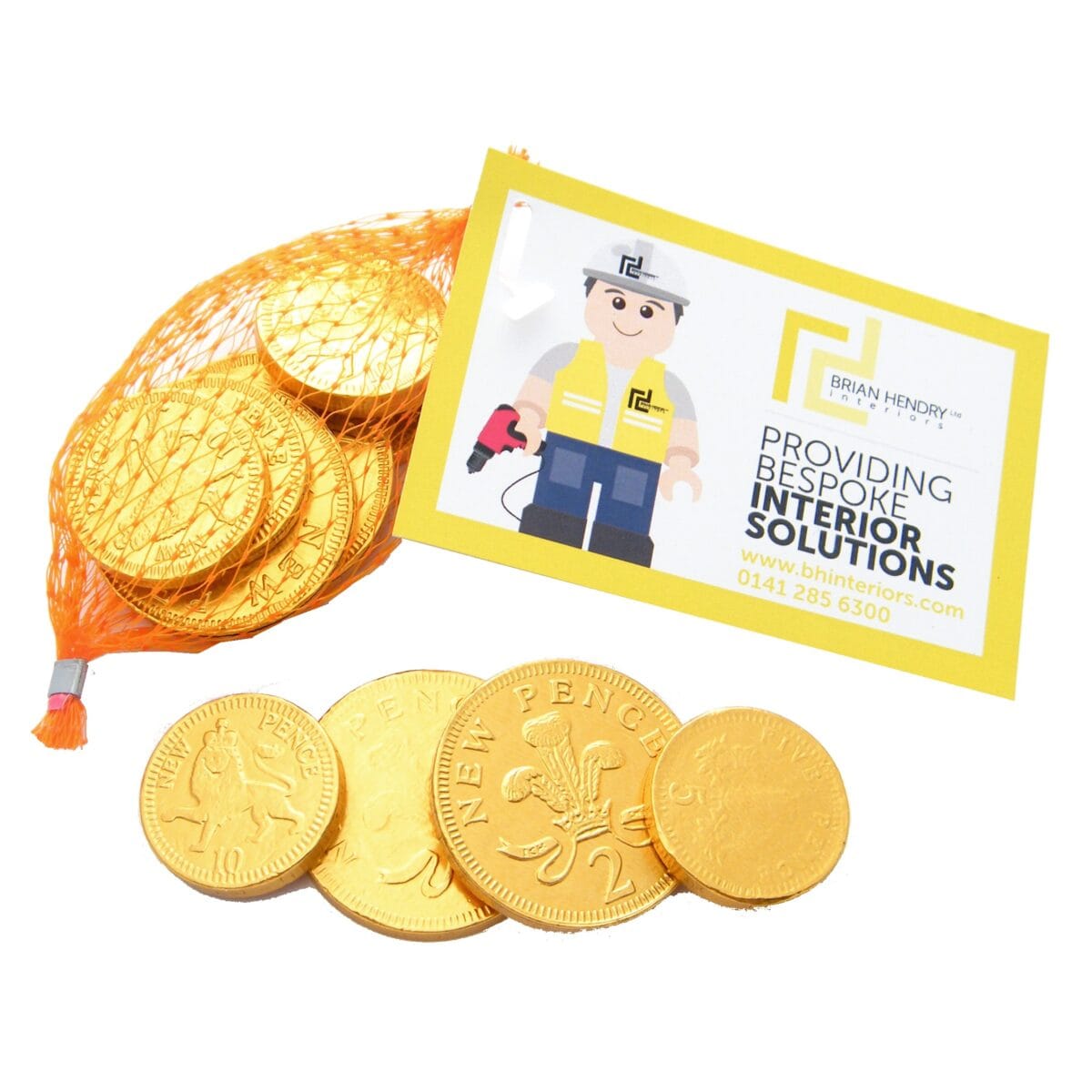 Bespoke Promotional Chocolate Coin Options In the United Kingdom chocolate coins mimic the design of real money; they are traditionally bought around Christmas and are used to decorate the Christmas tree and to fill the stockings of children. When children visit a friend or relative they are allowed to find and take chocolates from the tree as a treat. A variant of this is that chocolate coins are hidden somewhere in the house for children to find, often in the form of a treasure trail.
